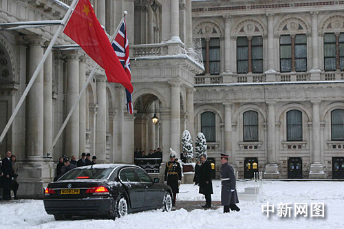 倫敦當(dāng)?shù)貢r(shí)間二月二日上午八時(shí)三十分許,正在這里進(jìn)行正式訪問的中國(guó)總理溫家寶前往英國(guó)外交部,出席布朗首相舉行的歡迎儀式。圖為溫家寶座車駛向觀禮臺(tái),英國(guó)首相布朗(右二)在車旁迎接。 中新社記者 張朔 攝