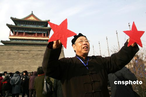 北平和平解放的見(jiàn)證者手持紅星重溫當(dāng)年歷史時(shí)刻。中新社發(fā) 富田 攝