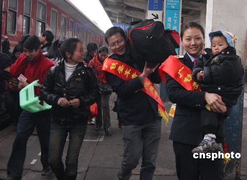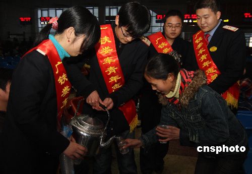 2月3日,湖南婁底車務(wù)段青年志愿者在婁底火車站為旅客提供各種幫助。當(dāng)日,婁底火車站迎來節(jié)后返程客流高峰,婁底車務(wù)段團(tuán)委近千名團(tuán)員青年志愿者開展了“和諧春運(yùn) 婁車青年志愿者與你同行”活動。在管區(qū)內(nèi),青年志愿者為旅客提供溫馨服務(wù),盡心為老弱病殘等旅客排憂解難。中新社發(fā) 郭國權(quán) 攝