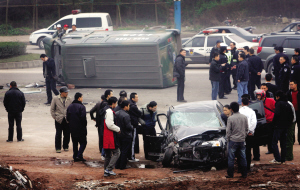 一連串的巨響后,一輛運(yùn)鈔車180度翻轉(zhuǎn)后重重地側(cè)翻在地,發(fā)生碰撞的轎車則朝前沖出10多米才停下。事故造成6人受傷。