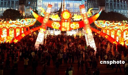 二月五日晚,為期五天的第三屆福州南后街元宵燈會在五一廣場、南后街同時正式亮燈,數(shù)百盞花燈呈現(xiàn)出濃濃的節(jié)日氣氛。圖為福州南后街元宵燈會五一廣場花燈展區(qū),一座50米長的大型門燈以及門燈后的“萬象更新”平安廊前人潮涌動,數(shù)萬市民絡繹不絕的到此觀賞獨具福州民俗特色的花燈。中新社發(fā) 劉可耕 攝