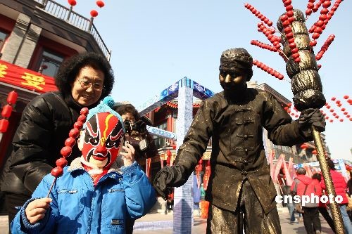 元宵節(jié)來臨,北京前門大街舉行民間花會(huì)踩街活動(dòng),借此宣告修繕一新的前門大街正式開街。踩街是一種中國(guó)傳統(tǒng)民間民俗藝術(shù)表演形式,類似國(guó)外的花車游行,表演隊(duì)伍邊行進(jìn)邊表演,百姓沿途觀看。圖為面戴京劇臉譜的男孩和真人扮演的“銅人”雕塑。中新社發(fā) 杜洋 攝