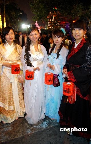 二月九日晚,在僑鄉(xiāng)泉州城擁擠的賞燈人群里,幾位特地身著漢服出游的年輕姑娘分外引人注目。中新社發(fā) 傅丹丹 攝