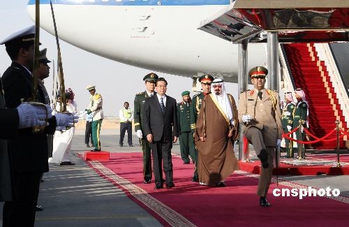 中國國家主席胡錦濤當?shù)貢r間十日下午乘專機抵達沙特阿拉伯首都利雅得,開始此次亞非五國的友好合作之旅。沙特國王阿卜杜拉在機場舉行隆重儀式,歡迎胡錦濤主席到訪。