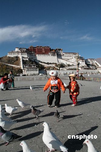 布達拉宮廣場上的孩童與鴿子。中新社發(fā) 扎西朗杰 攝
