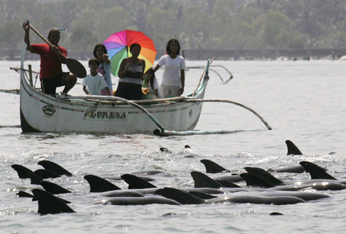 2月10日,約300只海豚被困在菲律賓巴丹省馬尼拉灣離岸不足1000米的近海水域,當(dāng)?shù)鼐用瘛⒎坡少e海岸警衛(wèi)和環(huán)保團(tuán)體人士幫助它們安全返回大海。