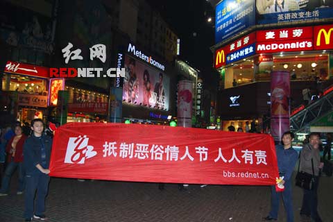 “快來(lái)看,抵制惡俗情人節(jié),人人有責(zé)!這活動(dòng)真好,你還過(guò)什么情人節(jié)啊?!”12日晚上7點(diǎn)半,在長(zhǎng)沙黃興南路步行街上,兩名男子拉起了一個(gè)約四米長(zhǎng)一米寬的抵制情人節(jié)的橫幅,引起了許多路人的興趣,還有不少人上前簽名表示支持這種活動(dòng),橫幅上簽有許多秘密麻麻的支持該活動(dòng)的留言,當(dāng)然,還吸引來(lái)了長(zhǎng)沙各大媒體來(lái)采訪(fǎng),也有人認(rèn)為這有作秀的嫌疑,可謂眾說(shuō)紛紜。