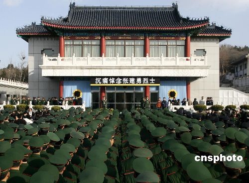 2月14日上午,張建勇烈士遺體告別儀式在北京八寶山殯儀館舉行,北京市相關(guān)單位負(fù)責(zé)人以及烈士親屬、戰(zhàn)友、生前好友600余人參加。2月10日凌晨1時(shí)40分,北京市公安局消防局朝陽(yáng)支隊(duì)紅廟中隊(duì)指導(dǎo)員張建勇,在撲救央視新址附屬文化中心在建工地重大火災(zāi)中壯烈犧牲,離他30歲生日僅有16天。2月12日,中國(guó)公安部批準(zhǔn)張建勇為革命烈士。中新社發(fā) 富田 攝