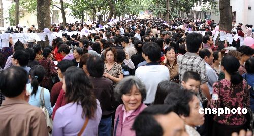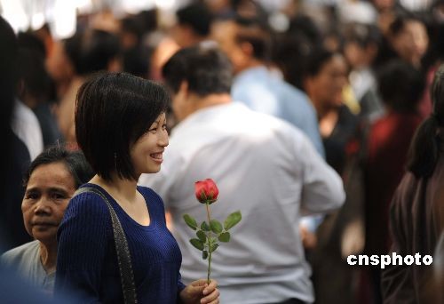 二月十四日,情人節(jié),廣西南寧市組織大型相親交友活動(dòng)。這場(chǎng)名為“媽媽相親團(tuán)”的交友活動(dòng),由于交友過(guò)程可由父母代勞,得到當(dāng)?shù)厍嗄甑臒崃掖蹬,?dāng)天有超過(guò)一萬(wàn)名青年報(bào)名參與相親,場(chǎng)面十分火爆,眾多父母到場(chǎng)為兒女相親。中新社發(fā) 蔣雪林 攝