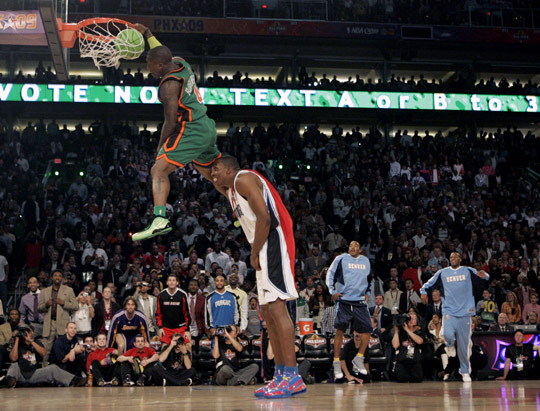 中新網(wǎng)2月15日電 北京時間2月15日,NBA全明星周末繼續(xù)進(jìn)行,其中深受全世界球迷喜愛的扣籃大賽火爆上演。身高只有1米70的“小土豆”內(nèi)特-羅賓遜在決賽中做出了飛躍上屆扣籃大賽冠軍、身披“超人”斗篷的霍華德后扣籃的動作,這個被稱為“飛躍超人”的扣籃使羅賓遜繼2006年后第二次獲得扣籃王,成為2009年全明星周末的扣籃冠軍。