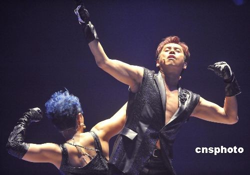 二月十四日晚,“香港二零零九東亞運(yùn)動(dòng)會(huì).左麟右李演唱會(huì)”在香港紅磡體育館作尾場(chǎng)演出。圖為歌星譚詠麟、李克勤特別為是次演唱會(huì)強(qiáng)身,兩人演出時(shí)不忘展示麒麟臂及胸肌。 中新社發(fā) 鄧慶樂(lè) 攝