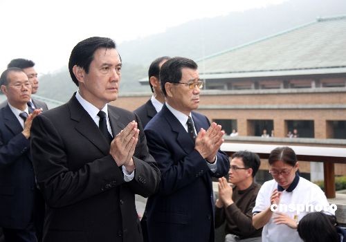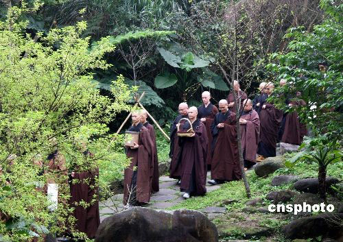 2月15日,臺(tái)灣法鼓山創(chuàng)辦人圣嚴(yán)法師追思法會(huì)暨植存在法鼓山舉行。參加追思法會(huì)暨植存的臺(tái)灣地區(qū)領(lǐng)導(dǎo)人馬英九、蕭萬長隨眾僧和信眾送圣嚴(yán)法師舍利函前往植存區(qū)。中新社發(fā) 陳立宇 攝