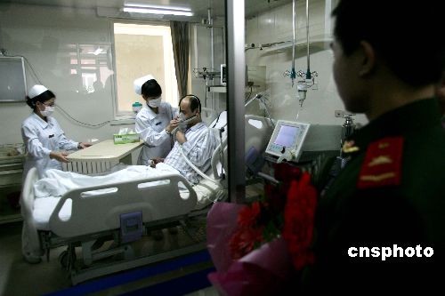 圖為出院戰(zhàn)士在張少輝的病房前與其道別。中新社發(fā) 富田 攝