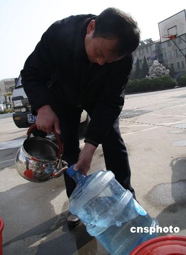 2月21日,江蘇省鹽城市各主干道上,消防車輛正為市民輸送安全用水,確保鹽城市民能夠安心喝上未被污染的自來水。由于水廠受酚類化合物污染,鹽城市區(qū)2月20日出現(xiàn)大面積停水,居民生活受到較大影響。造成本次停水的水源地污染原因已經(jīng)確認,偷排污水的鹽城標(biāo)新化工有限公司被責(zé)令關(guān)閉,法人代表等相關(guān)責(zé)任人被采取強制措施。圖為鹽城市市委黨校內(nèi)前來取水的市民用純凈水桶取水。中新社發(fā) 童盛 攝