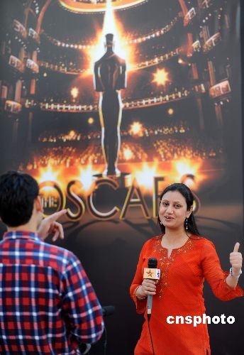 當(dāng)?shù)貢r(shí)間二月二十日,印度星空衛(wèi)視的記者正在好萊塢柯達(dá)劇場(chǎng)前進(jìn)行現(xiàn)場(chǎng)報(bào)道。全球影迷矚目的第八十一屆奧斯卡電影金像獎(jiǎng)?lì)C獎(jiǎng)典禮將于二十二日晚在這里舉行,通往劇場(chǎng)的巨大紅地毯已經(jīng)鋪就,各項(xiàng)準(zhǔn)備工作基本就緒。由印度演員出演的印度題材電影《貧民富翁》被認(rèn)為是今年最佳影片獎(jiǎng)的最大熱門。中新社發(fā) 張煒 攝