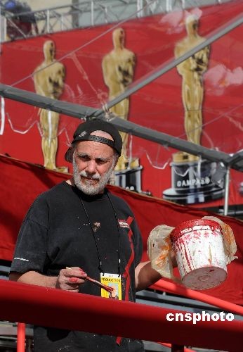 當(dāng)?shù)貢r間二月二十日,工作人員正在好萊塢柯達(dá)劇場外粉刷明星抵達(dá)看臺。全球影迷矚目的第八十一屆奧斯卡電影金像獎頒獎典禮將于二十二日晚在柯達(dá)劇場舉行,通往劇場的巨大紅地毯已經(jīng)鋪就,明星抵達(dá)看臺搭建完畢,各項(xiàng)準(zhǔn)備工作基本就緒。中新社發(fā) 張煒 攝