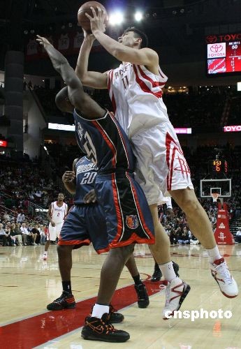 火箭隊(duì)2月22日在休斯頓主場以99-78輕取山貓,本賽季第二次取得四連勝。姚明上場36分鐘,拿下19分、7個籃板和2個蓋帽。圖為姚明強(qiáng)行突破上籃。中新社發(fā) 歐文 攝