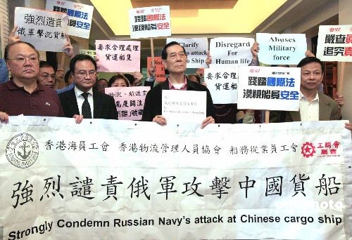 二月二十四日,香港船員及船務(wù)運(yùn)輸業(yè)界代表前往俄羅斯駐香港領(lǐng)事館進(jìn)行抗議,要求俄羅斯當(dāng)局嚴(yán)懲肇事者,并對(duì)死傷者負(fù)責(zé)。二月十五日,由香港船公司租憑的貨輪“新星號(hào)”遭俄羅斯海軍炮擊而沉沒,造成八名船員失蹤及死亡。中新社發(fā) 張勤 攝