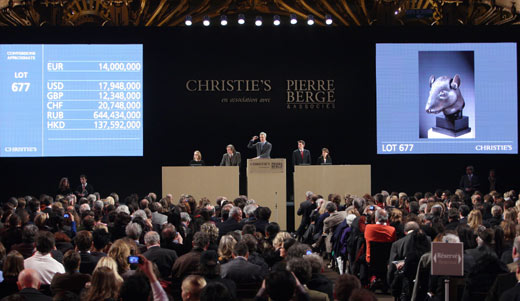 法國佳士得拍賣行二十五日晚間在巴黎拍賣中國圓明園流失文物鼠首和兔首銅像,兩個(gè)獸首分別以一千四百萬歐元的價(jià)格被神秘的電話買家買走。