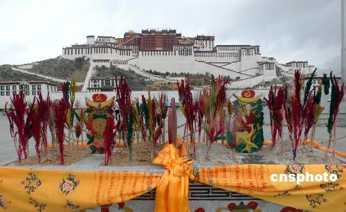 藏歷新年期間,風景秀麗的布達拉宮廣場上供奉了幾只大型的“切瑪”,象征著五谷豐登、風調(diào)雨順和吉祥如意的美好愿景。供奉“切瑪”是藏族民眾的新年傳統(tǒng)習俗,切瑪盒內(nèi)一頭裝有拌好的酥油糌粑,另一頭裝滿小麥,壘成金字塔型,中間插上一朵花或酥油制的“字珠”。中新社發(fā) 周波 攝