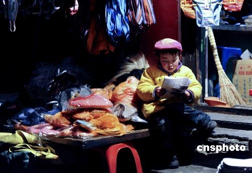 2月28日,中國(guó)藏歷新年期間,拉薩八廓街一間甘肅店主的商鋪前,店主的小孩在商攤夜讀功課,十分專(zhuān)注。中新社發(fā) 廖攀 攝