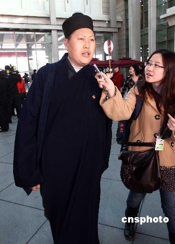 3月1日,赴北京參加“兩會(huì)”的全國政協(xié)委員、四川省道教協(xié)會(huì)會(huì)長、青城山天師洞道觀道長唐誠,剛一抵達(dá)北京機(jī)場就被記者追訪。2OO9年全國“兩會(huì)”即將開幕,代表、委員們已開始陸續(xù)抵京報(bào)到。中新社發(fā) 杜洋 攝