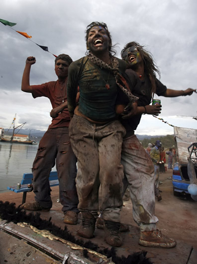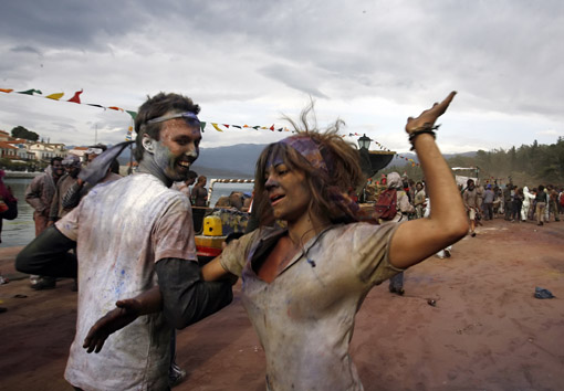 3月2日,人們?cè)谙ED雅典西北小城加拉希迪的街道上用加了各種天然顏料的面粉互相投撒,表達(dá)祝福。