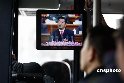3月3日,全國政協(xié)十一屆二次會議在北京人民大會堂開幕,北京市民在公交車上通過移動電視收看相關(guān)報(bào)道。中新社發(fā) 鄭雄增 攝