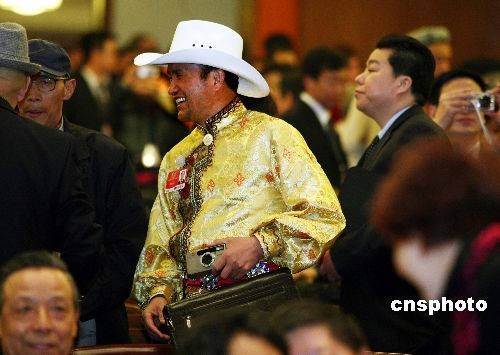 全國政協(xié)十一屆二次會議3月3日下午在人民大會堂開幕,一名少數(shù)民族委員攜相機(jī)和電腦出席大會。中新社發(fā) 宋吉河 攝