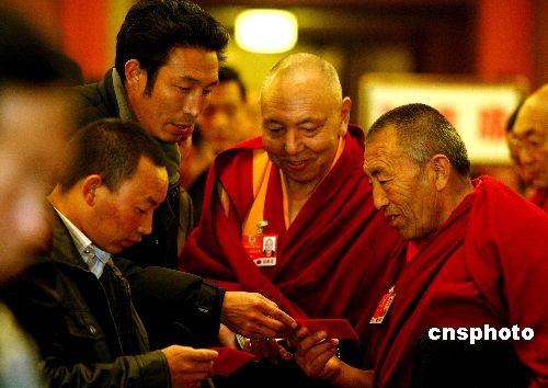 兩會期間,幾位參加全國政協(xié)十一屆二次會議的宗教界人士,新奇地翻閱“兩會”駐地提供的《會議生活服務指南》。今年的“兩會”駐地為宗教界代表委員、少數(shù)民族代表委員提供了眾多的貼心服務。中新社發(fā) 宋吉河 攝