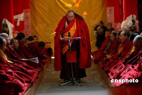 3月4日,藏歷新年正月初八,拉薩色拉寺舉行傳昭大法會(huì),僧人們會(huì)進(jìn)行傳統(tǒng)的辯經(jīng)、祈愿、頌經(jīng)等佛事活動(dòng)。每年的傳昭大法會(huì)從藏歷正月初八開(kāi)始,持續(xù)到藏歷正月十五。圖為在色拉寺大殿內(nèi)高僧在進(jìn)行誦經(jīng)。中新社發(fā) 劉震 攝