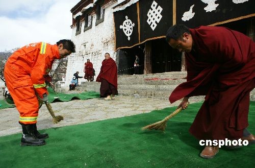3月4日,藏歷新年正月初八,拉薩色拉寺舉行傳昭大法會(huì),僧人們會(huì)進(jìn)行傳統(tǒng)的辯經(jīng)、祈愿、頌經(jīng)等佛事活動(dòng)。每年的傳昭大法會(huì)從藏歷正月初八開(kāi)始,持續(xù)到藏歷正月十五。圖為色拉寺消防大隊(duì)的士兵在辯經(jīng)前協(xié)助僧人清潔辯經(jīng)現(xiàn)場(chǎng)。中新社發(fā) 劉震 攝