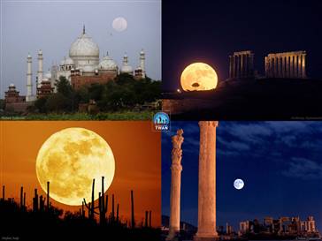 本圖顯示的是夜晚升起于世界四大著名景點上空的滿月。從左上圖起按順時針方向看,四幅子圖分別是:印度阿格拉市郊的泰姬陵、希臘蘇尼翁海岬的海王波塞冬神殿、伊朗設拉子市的波斯波利斯古城遺址以及亞利桑那州的仙人掌國家公園。泰姬陵是印度知名度最高的古跡之一,位于距印度新德里約200多公里外的阿格拉城內(nèi),是莫臥兒王朝第5代皇帝沙賈汗為了紀念已故皇后而修建的陵墓,被譽為“完美建筑”。仙人掌國家公園位于美國亞利桑那州南部,靠近墨西哥邊境。景區(qū)總面積約369平方公里,主要分為兩部分,一部分位于東郊,另外一部分位于西郊。這是一個以欣賞仙人掌和沙漠風光為特色的國家公園。