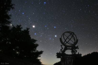 每當夜晚,你走出房間可能會在夜空中看到一顆非常明亮、略帶微紅色的物體,那就是火星。在本圖中,御夫座群星中間的那顆最大亮點就是火星,恰好與夜幕下的中國渾天儀遙相呼應(yīng)。渾天儀是清康熙年間欽天監(jiān)官員南懷仁等制造,并于1669年進呈朝廷的。儀器由三層環(huán)架組合、上圓下方的造型,是中國傳統(tǒng)渾天儀的表現(xiàn)形式,但在刻度和設(shè)計原理上卻采用了西方法度及5世紀托勒密的地心說,可見這是中西科技融合的作品。由于這件渾天儀能夠科學(xué)地演示日月交食之成因,一經(jīng)進入宮廷使用,對于康熙朝再度應(yīng)用西洋歷法、改進中國測天儀器等都起了積極的作用。