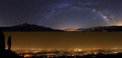 “夜空下的世界”項(xiàng)目的另外一重要目標(biāo),就是提醒人類注意城市燈光污染,F(xiàn)在城市明亮的燈光已讓人們很難看到夜空中的星星。本圖上半部分的弧形,其實(shí)就是伊朗北部上空的銀河,而下半部分則是燈光污染的德黑蘭。耀眼的燈光在照亮世界的同時也帶來了燈光污染,太亮的燈光可能導(dǎo)致居民無法安睡、司機(jī)駕車炫目等。對天文學(xué)家和天文愛好者來說,眾多的強(qiáng)亮光還嚴(yán)重影響他們觀測星空。世界多個國家已經(jīng)開始與燈光污染作斗爭,比如在一些新開發(fā)的地區(qū),要求安裝不正對空中的燈光裝置,鼓勵夜晚照明燈光全部射向地面。
