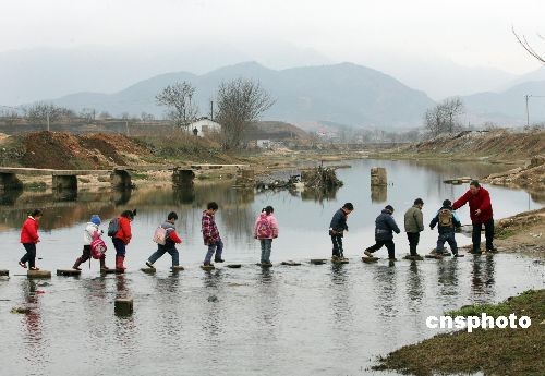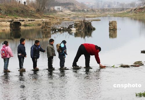 3月3日,在斷橋下游約100米處,蔡店中心小學(xué)學(xué)前班班主任郭炳香在河中為孩子們鋪過河石。武漢市黃陂區(qū)蔡店鄉(xiāng)姚蔡河上一座連通兩岸的小橋于2008年7月2日被洪水沖垮,此后一直無人修復(fù),附近300多名孩子只好趟河去上學(xué)。