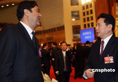 3月5日上午,十一屆全國人大二次會議在北京人民大會堂開幕,全國人大代表、山西省副省長李小鵬(右)會前與新疆維吾爾自治區(qū)主席努爾·白克力交談。中新社發(fā) 任晨鳴 攝