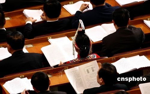 3月5日上午,十一屆全國人大二次會議在北京人民大會堂開幕,國務(wù)院總理溫家寶作《政府工作報(bào)告》,參會代表邊聽邊認(rèn)真閱讀報(bào)告文本。中新社發(fā) 杜洋 攝