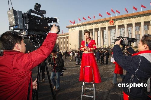 3月5日,十一屆全國人大二次會議在北京人民大會堂隆重舉行。大會吸引了近4000名中外記者前來采訪報(bào)道。圖為內(nèi)蒙古電視臺的記者在大會堂外做現(xiàn)場報(bào)道。中新社發(fā) 李松 攝