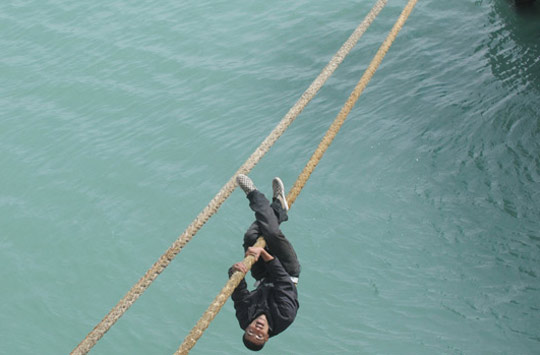 3月5日,在直布羅陀海峽的丹吉爾港,一名摩洛哥男子試圖通過(guò)繩索爬向一只駛向西班牙的船只,最終被安全人員逮捕。