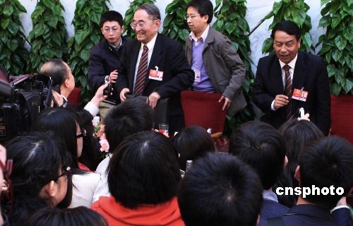 3月6日下午,全國(guó)政協(xié)十一屆二次會(huì)議記者會(huì)在北京人民大會(huì)堂舉行,厲以寧、李德水、方方、王文彪、陳錫文五位全國(guó)政協(xié)委員到會(huì)答記者問(wèn)。記者會(huì)結(jié)束時(shí),被中外記者追堵采訪。中新社發(fā) 宋吉河 攝