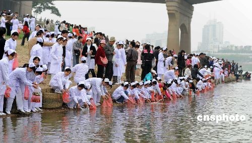 三月八日,為慶祝三八國(guó)際勞動(dòng)?jì)D女節(jié),廣西南國(guó)早報(bào)網(wǎng)組織南寧市女性在南寧母親河——邕江放生百萬尾魚苗。中新社發(fā) 蔣雪林 攝
