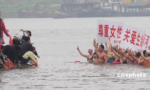 圖:南寧冬泳愛好者游邕江慶祝三八節(jié)