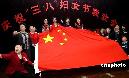 3月8日晚,參加全國(guó)政協(xié)十一屆二次會(huì)議的婦聯(lián)界委員們?cè)隈v地賓館共度婦女節(jié),聯(lián)歡會(huì)上委員們合唱“繡紅旗”把晚會(huì)推向高潮。中新社發(fā) 傅丹丹 攝