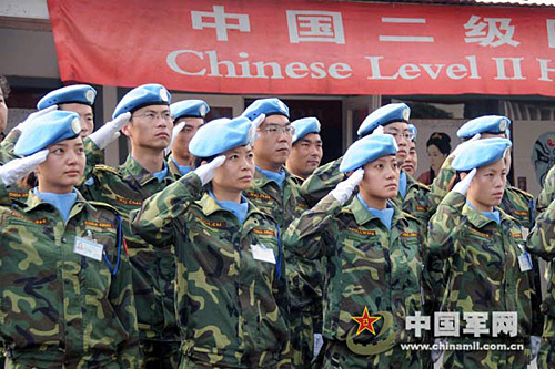 中國第九批赴剛果(金)維和醫(yī)療分隊舉行升國旗儀式,紀念三八國際婦女節(jié)。武國強 攝