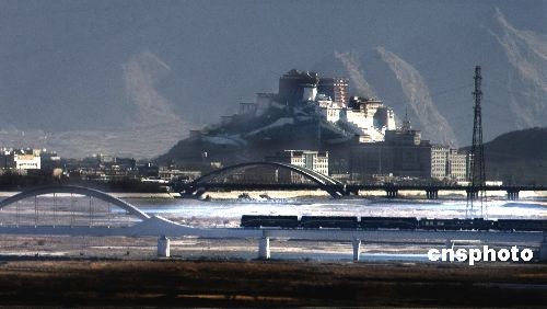 3月9日,青藏鐵路上的列車駛過(guò)拉薩城西側(cè)的拉薩河大橋。據(jù)悉,有關(guān)方面爭(zhēng)取今年“五一”前開(kāi)行青藏鐵路五星級(jí)豪華列車。目前,已經(jīng)有不少旅行社聯(lián)系青藏鐵路五星級(jí)列車,客源情況很好。中新社發(fā) 廖攀 攝
