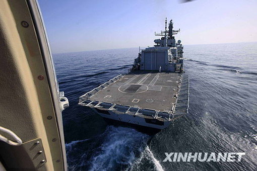 3月9日,在巴基斯坦南部卡拉奇港附近的阿拉伯海舉行的“和平-09”海上多國聯(lián)合軍事演習實兵演練中,澳大利亞海軍觀察員(右)在中國海軍“廣州”號驅逐艦上觀摩演習。查春明 攝