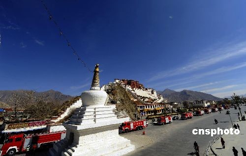 3月10日,西藏公安消防特種裝備車輛駛過布達(dá)拉宮廣場(chǎng)。當(dāng)日,西藏公安消防特種裝備車輛服役儀式在拉薩市舉行,26輛消防車輛在市區(qū)主要街道進(jìn)行拉動(dòng)演練。中新社發(fā) 廖攀 攝