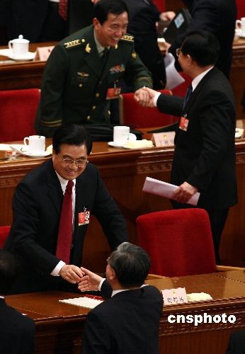 3月10日,中國(guó)國(guó)家主席胡錦濤在第十一屆全國(guó)人民代表大會(huì)第二次會(huì)議第三次全體會(huì)議結(jié)束后和代表握手。中新社發(fā) 杜洋 攝