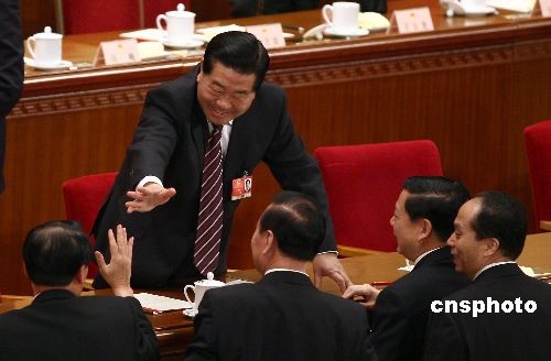 3月10日,全國政協(xié)主席賈慶林在十一屆全國人大會二次會議第三次全體會議結(jié)束后和代表握手。中新社發(fā) 杜洋 攝